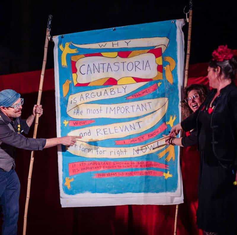 “Cantastoria” is the Italian word for an ancient form of street theater involving a narrator singing or telling a story while gesturing to elaborate painted banners or scrolls. “Cranky” shows are a similar form using a painted scroll which is displayed using a “crank.”